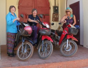 Our first stop was to a temple in Laos where we were asked to hire Laos wrap skirts (women) before entering. Bare shoulders were allowed but we were not to go Laos skirt free! Just to be rebelious, we jumped onto some bikes in our skirts!