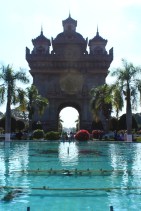 The next stop was the an arch in Vientiene, which was built to replicate the Arch de triomph, with a Thai flavour. Bruce, Lorraine, Colin and I climbed to the top and were amazed to see the market stalls set up inside.